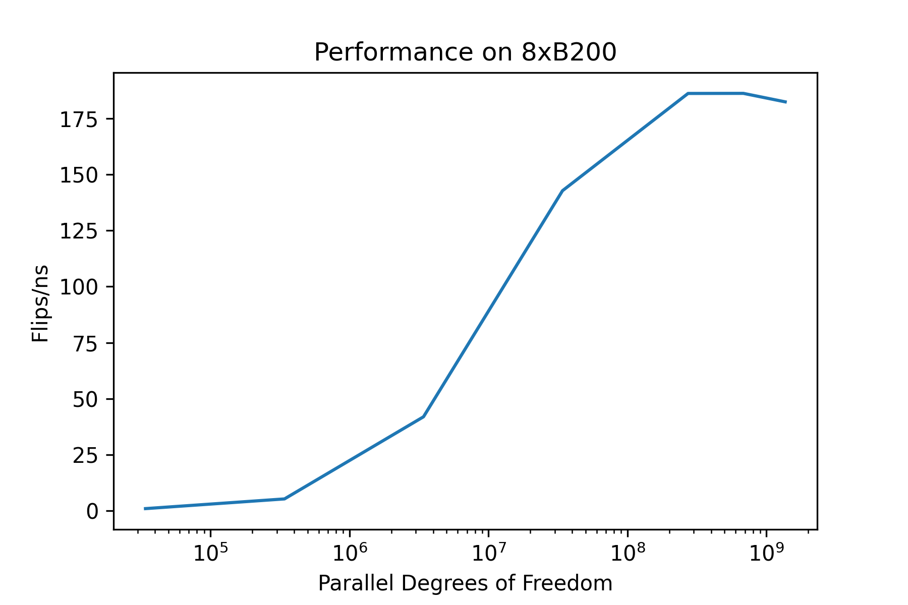 Because THRML is written in jax, it runs sampling programs very efficiently on GPUs and is competitive with the state of the art for sampling from sparse Ising models. Let's demonstrate that with a simple benchmark,